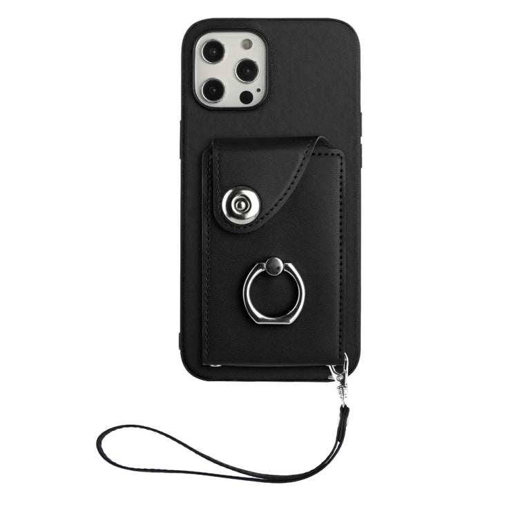 Funda para Teléfono iPhone 12 Pro Max PU con Soporte Anillo y Bolsa para Tarjeta con Cordón (Negro)