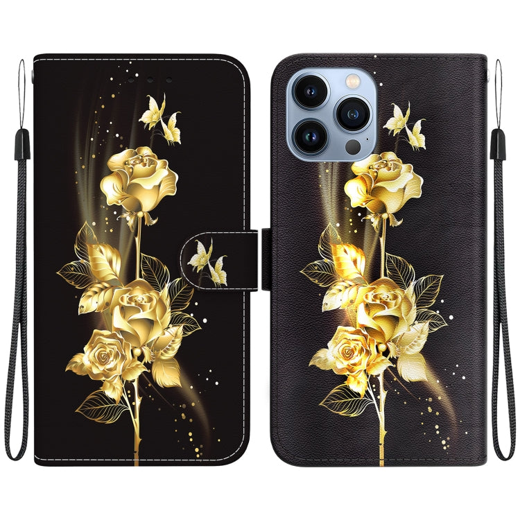 Estuche para teléfono iPhone 14 Pro Max cuero dibujo coloreado textura cristal (Mariposa Dorada Rosa)