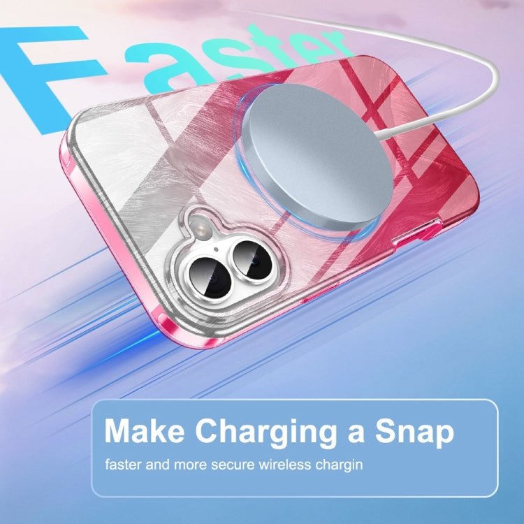 Funda híbrida TPU PC para iPhone 16 Plus con diseño de plumas y degradado Imd (Rosa Rojo)