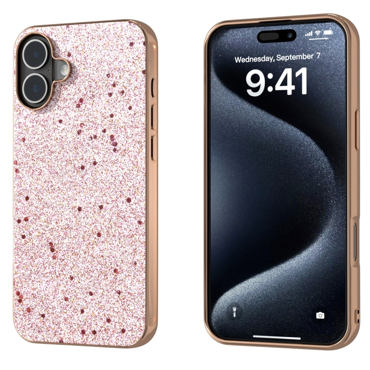 Funda para iPhone 16 Plus con Marco Galvanizado y Purpurina a Prueba de Golpes (Dorado y Rosa)