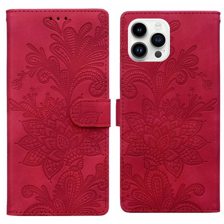 Funda de Cuero con Hebilla Magnética y Encaje Floral en Relieve para iPhone 16 Pro (Rojo)