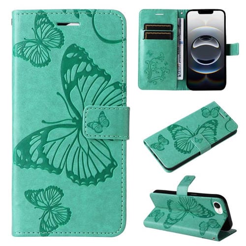 Funda de Cuero con Tapa para iPhone 16E Diseño Mariposa En Relieve 3D (Verde)