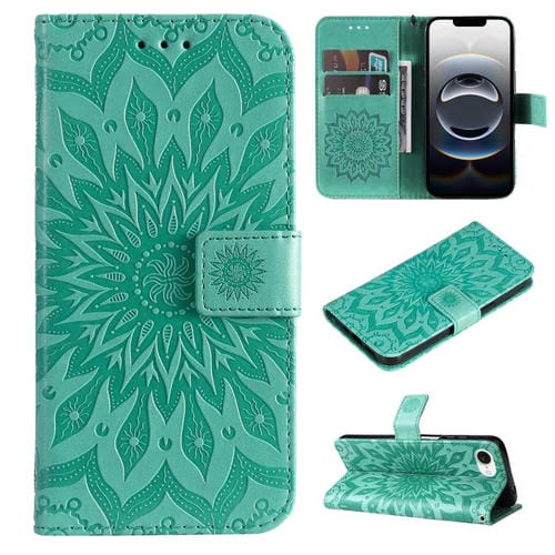 Funda de Cuero con Tapa para iPhone 16E Estampado Girasoles En Relieve (Verde)