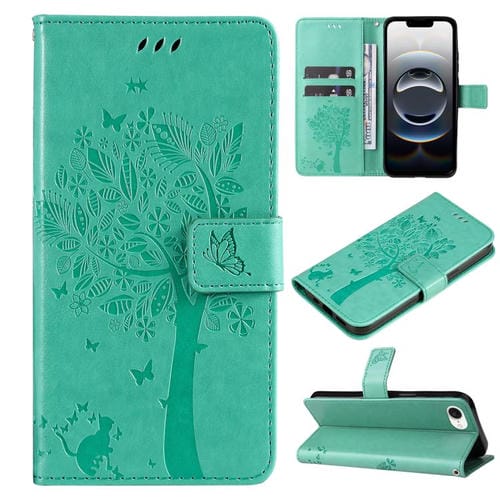 Funda de Cuero con Tapa para iPhone 16E Diseño Árbol y Gato en Relieve (Verde)