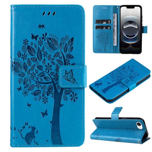 Funda de Cuero con Tapa para iPhone 16E con Diseño de Árbol y Gato En Relieve (Azul)