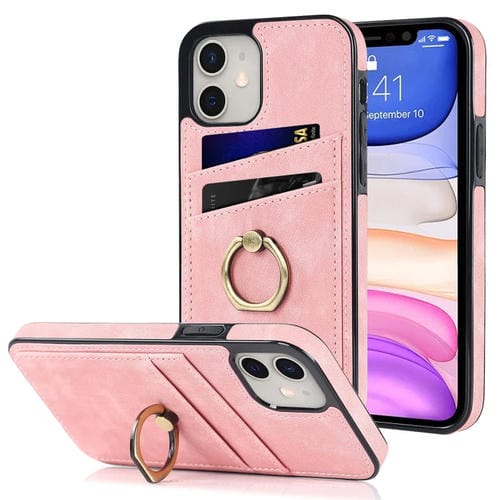 Funda de Teléfono iPhone 11 Cuero Parche Vintage Soporte para Anillo (Rosa)