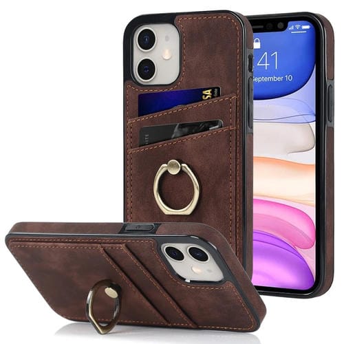 Funda de Teléfono iPhone 11 Cuero Parche Vintage Soporte Anillo (Marrón)