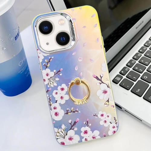 Caja de teléfono TPU para iPhone 14 con soporte de anillo de flor láser de galvanoplastia (Rose Ah15)