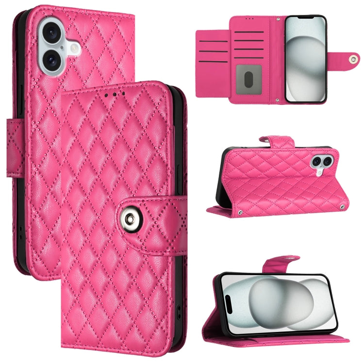 Funda de Cuero para iPhone 16 Plus con Tapa y Textura Rómbica con Cordón (Rojo Rosa)