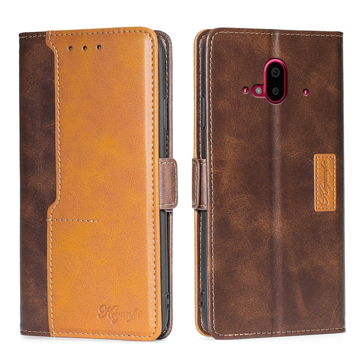 Funda de Cuero para Fujitsu Arrows F-52B con Hebilla Lateral en Contraste (Marrón Oscuro + Dorado)
