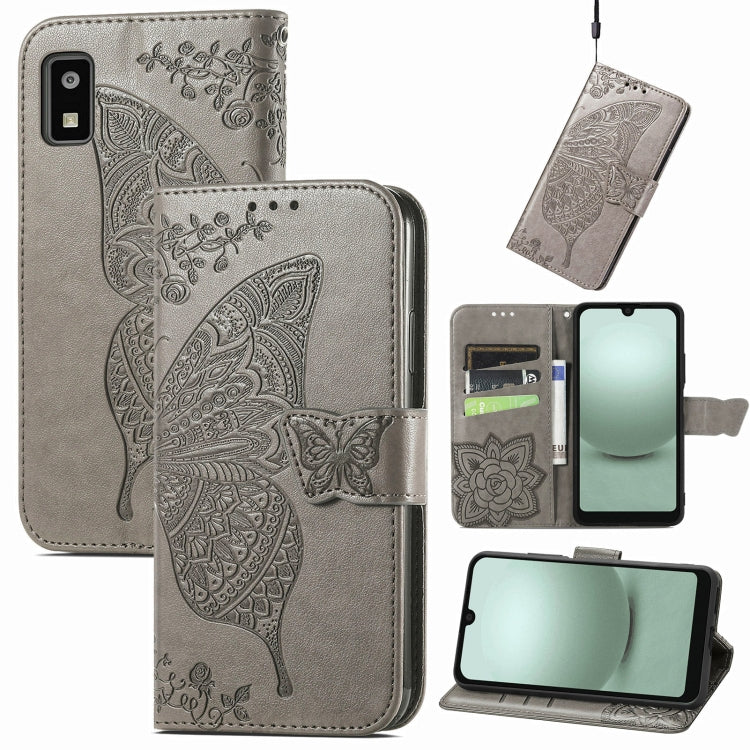 Funda de Cuero para Sharp Aquos Wish 3 Butterfly Love Flower en Relieve (Gris)