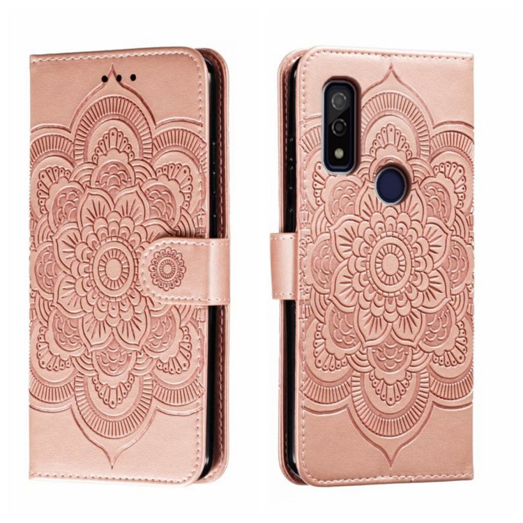 Funda de Cuero para Rakuten Hand 5G con Patrón Sun Mandala en Relieve (Oro Rosa)