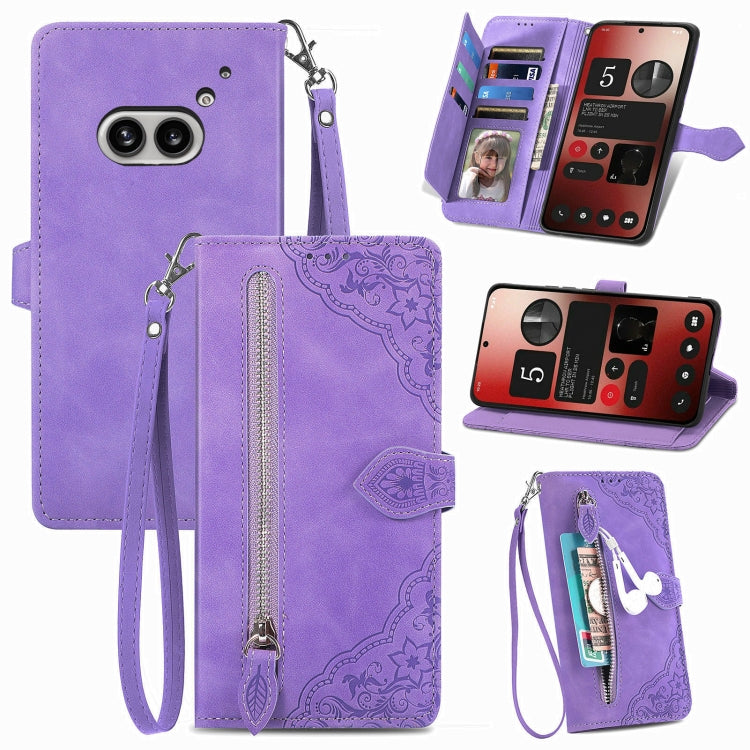 Funda para Nothing Phone 2A de Cuero con Cremallera y Flores en Relieve (Púrpura)