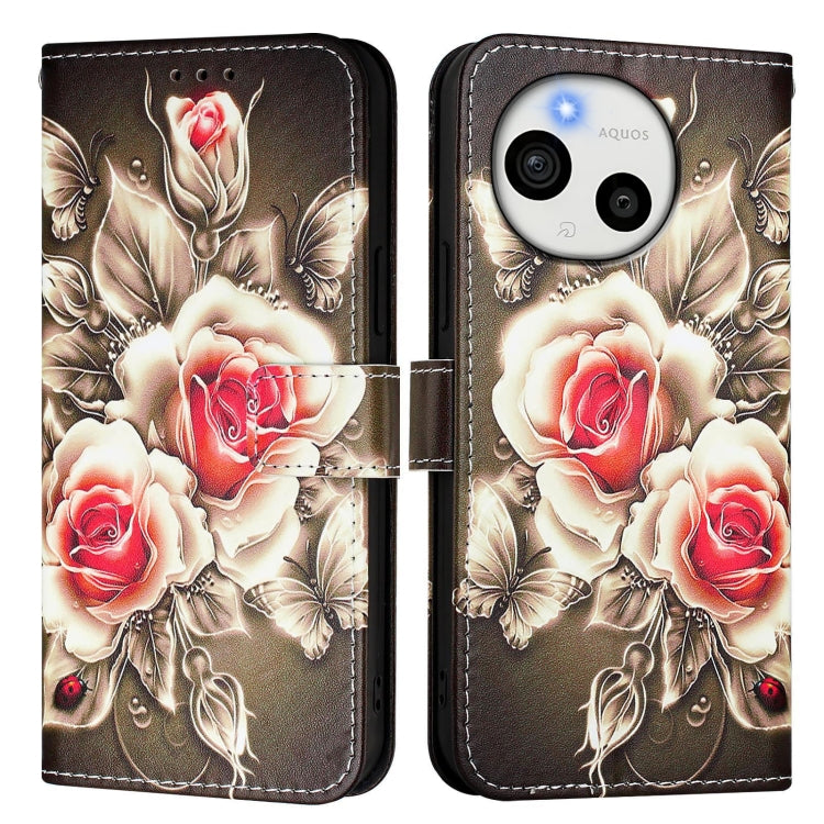 Funda de Cuero para Sharp Aquos Sense9 Plus con Diseño de Dibujos (Rosas Sobre Negro)