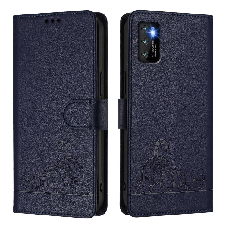 Funda de Cuero Rfid para Cubot A10 con Estampado de Rata y Gato en Relieve y Cordón (Azul)