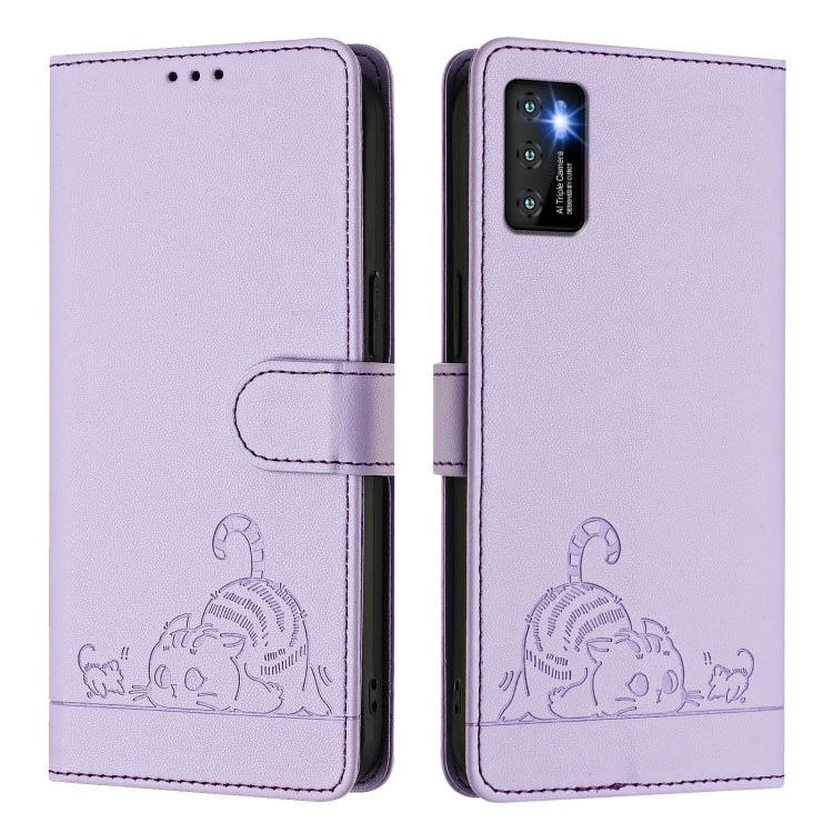 Funda de Cuero Rfid para Cubot P50 con Estampado de Rata y Gato en Relieve y Cordón (Morado)