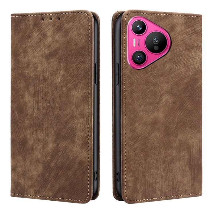 Funda de Cuero Magnética para Huawei Pura 70 con Cepillo Antirrobo RFID (Marrón)
