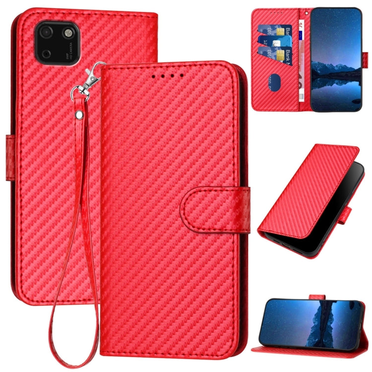 Funda de Cuero para Huawei Y5P Yx0070 con Hebilla de Fibra de Carbono y Cordón (Rojo)