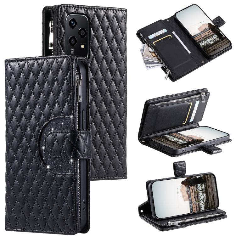 Funda de Cuero para Honor 200 Lite Glitter Lattice Zipper Wallet para Teléfono (Negro)