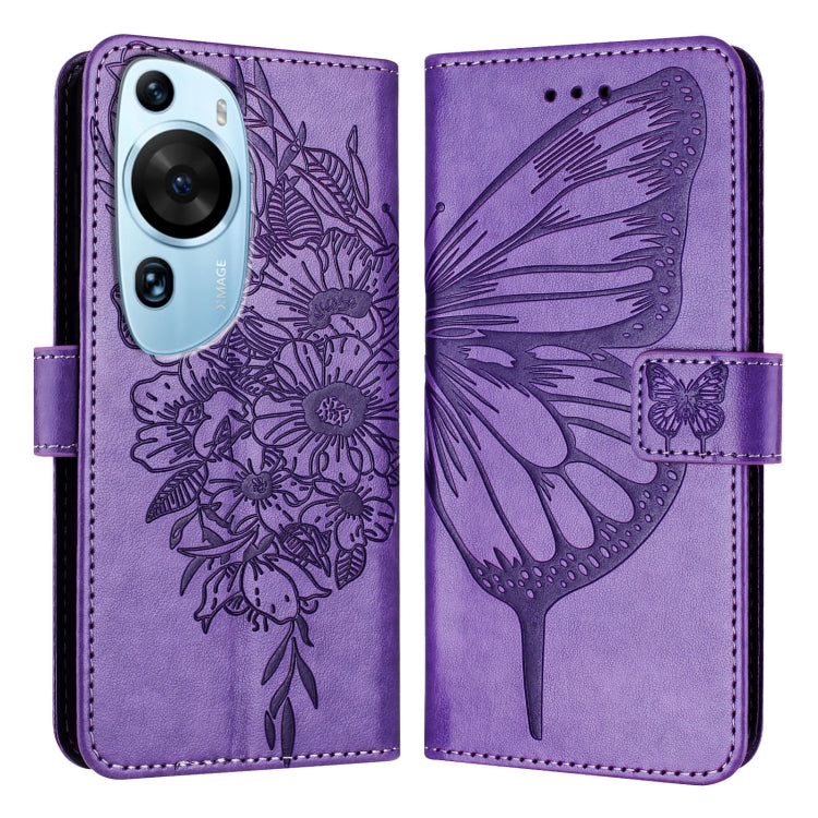 Funda de Cuero Huawei P60 y P60 Pro con Mariposa en Relieve (Púrpura Oscuro)