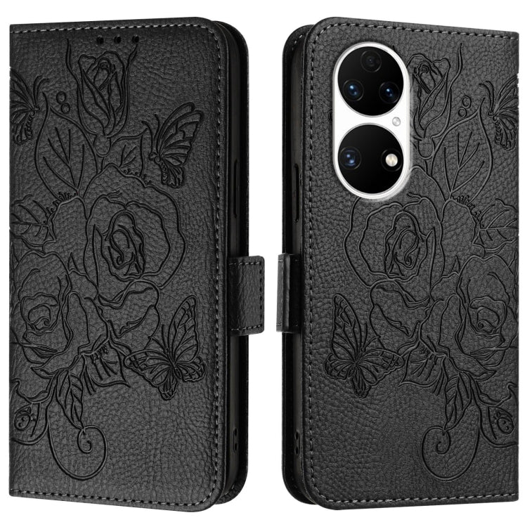 Funda para Huawei P50 de Cuero Antirrobo RFID con Rosa en Relieve (Azul Oscuro)