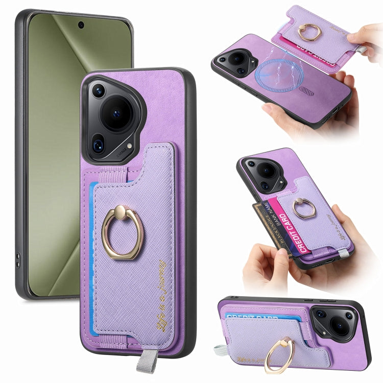 Funda para Teléfono Huawei Pura 70 Pro con Tarjetero y Anillo de Cuero Retro Magsafe (Morado)