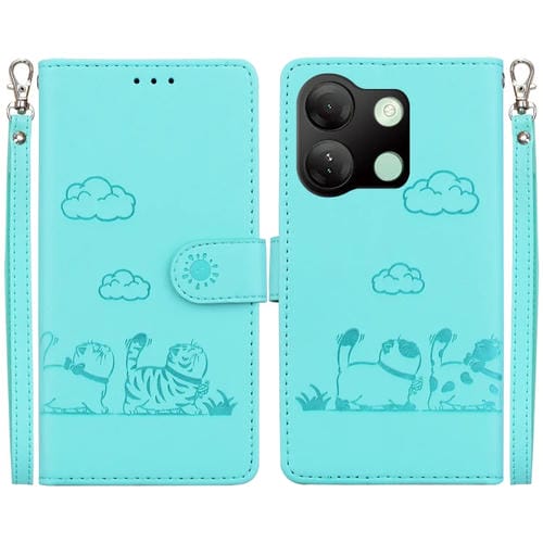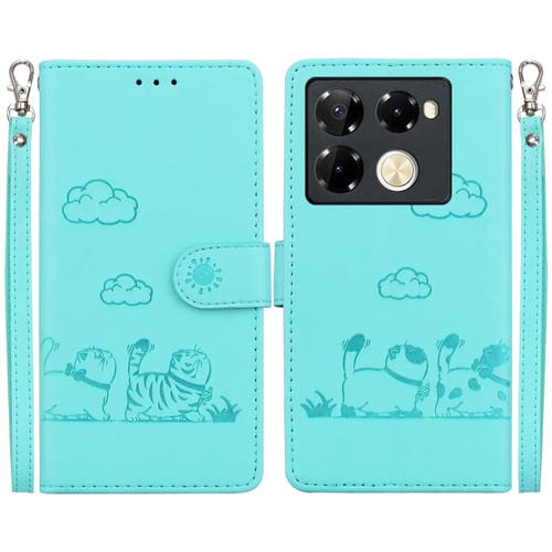 Funda de Cuero con Relieve de Gatito para Infinix Hot 30 Play NFC con Cordón (Verde Oscuro)