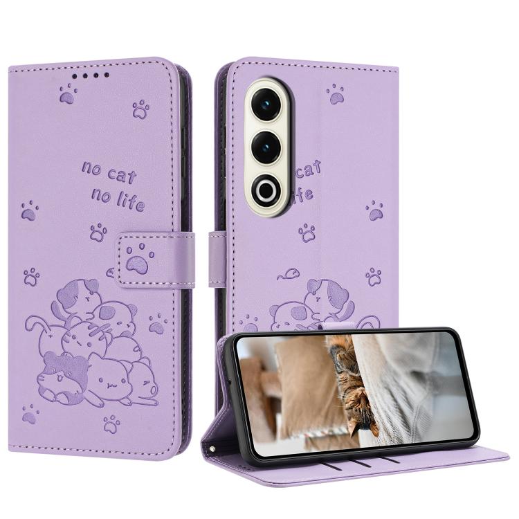 Funda de Cuero Itel S25 Ultra con Diseño de Gatito en Relieve y Cordón (Morado)