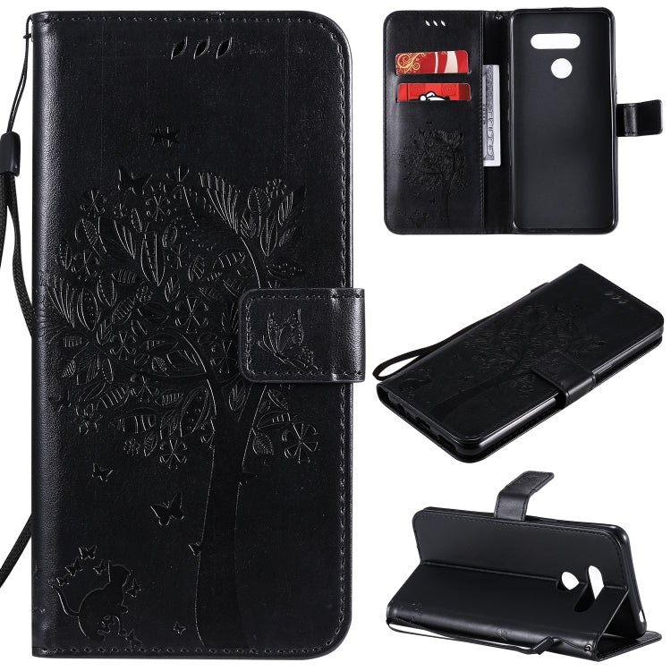 Funda de Cuero para LG K51 Tree & CAT con Tapa Horizontal, Soporte, Ranuras para Tarjetas y Cordón (Negro)