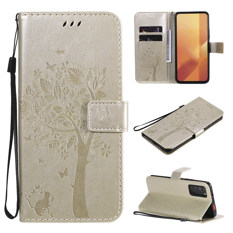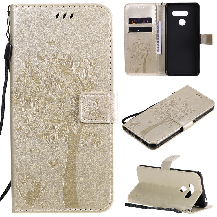 Funda de Cuero para LG K50S con Tapa Horizontal, Patrón Árbol y Gato, Soporte, Ranuras y Cordón (Oro Rosa)