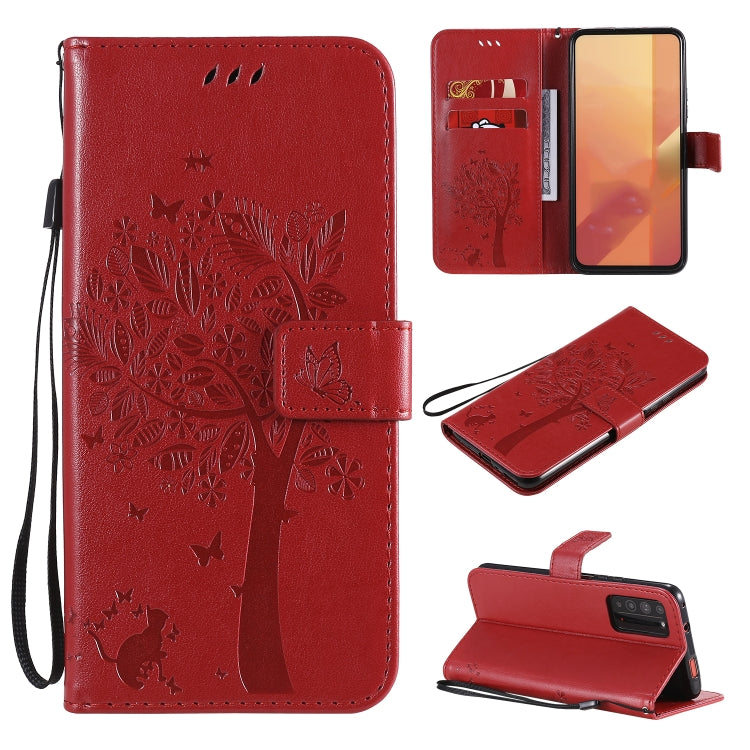 Funda de Cuero para LG K51 Tree & CAT con Tapa Horizontal, Soporte, Ranuras y Cordón (Rojo)