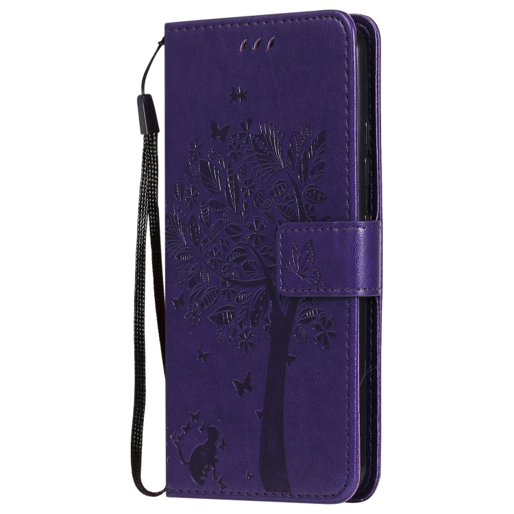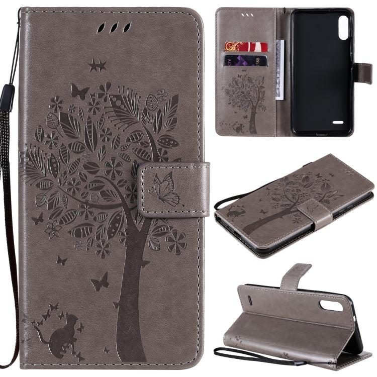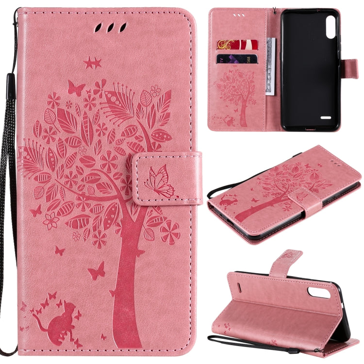 Funda Cuero PU LG K22 K22 Plus con Patrón Árbol y Gato, Tapa Horizontal, Soporte, Ranuras y Cordón (Café)