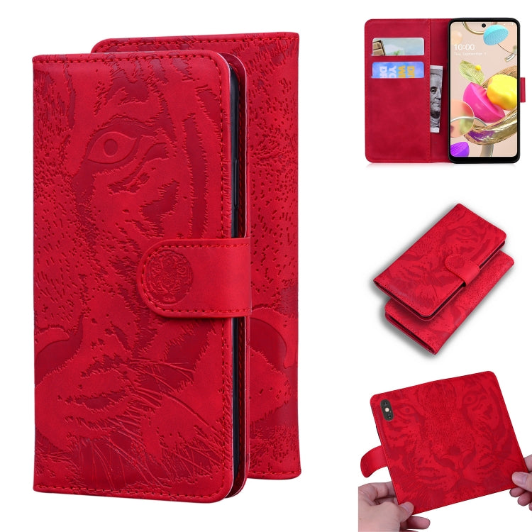 Funda Horizontal LG K42 Tiger Embossing Piel con Soporte, Ranuras y Billetera (Rojo)