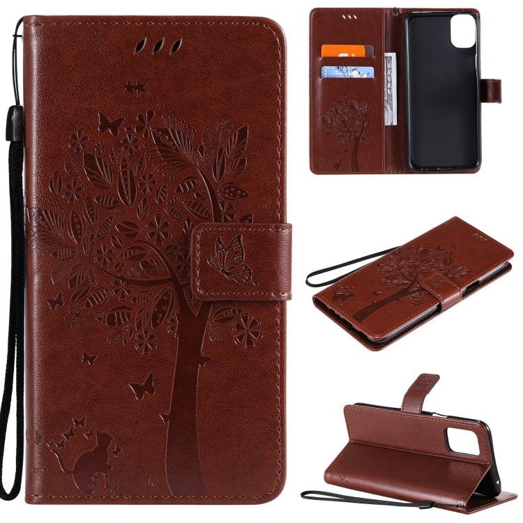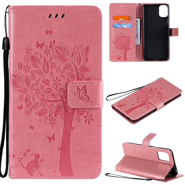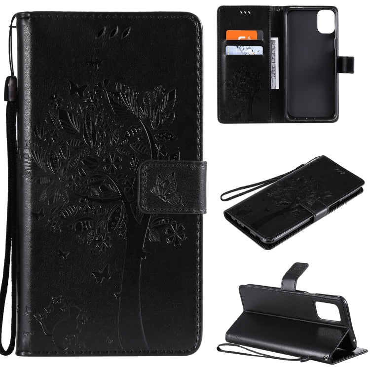 Funda Cuero PU LG K52 Árbol y Gato Patrón Impresión Prensada Horizontal con Soporte y Ranuras (Negro)
