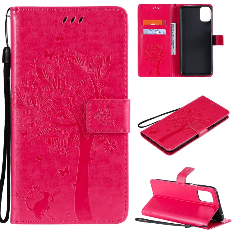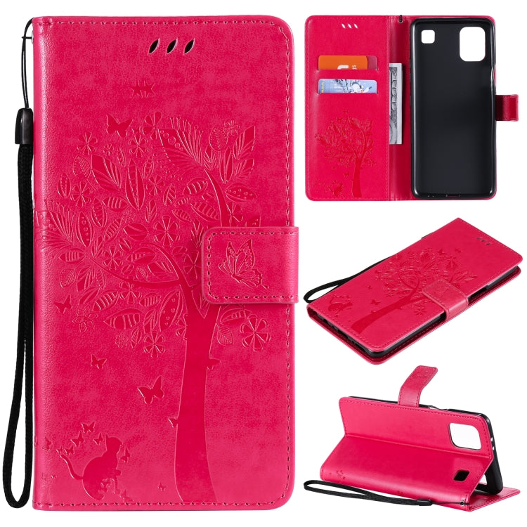 Funda de Cuero PU para LG K42 con Patrón Tree & CAT, Titular, Billetera y Cordón (Rose Rojo)