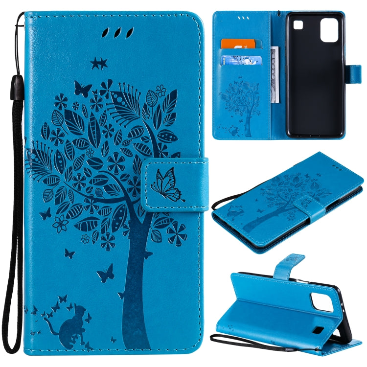Funda para LG K42 con patrón Tree & CAT, cuero PU, soporte, ranuras para tarjetas y cordón (Azul)