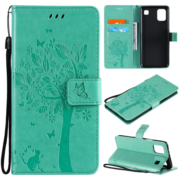 Funda Cuero PU LG K52 Árbol y Gato Impresión Prensado con Soporte, Billetera y Cordón (Verde)