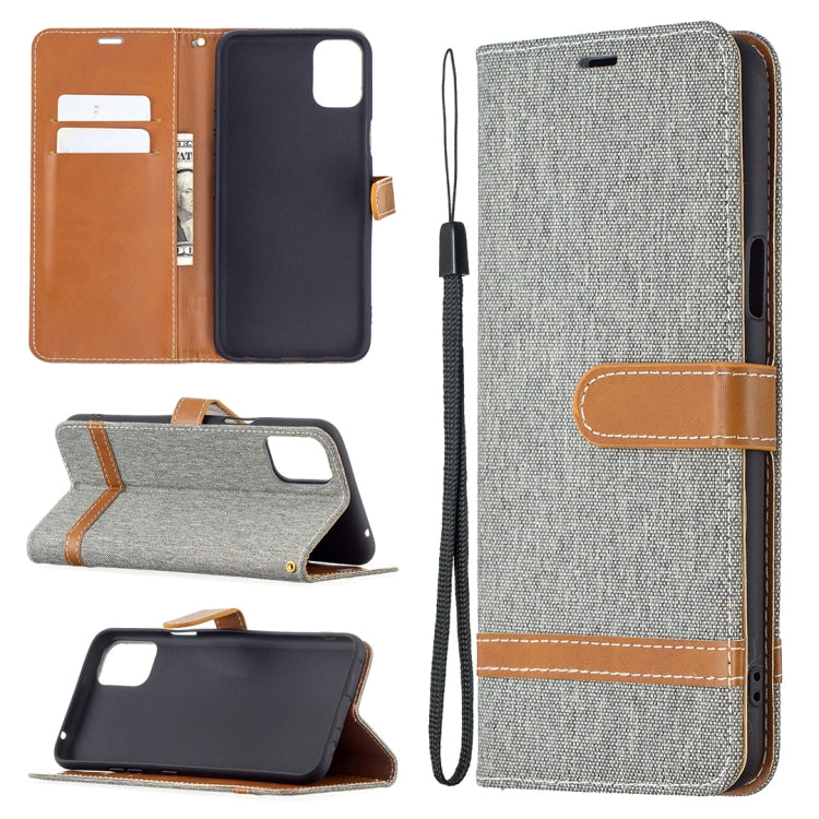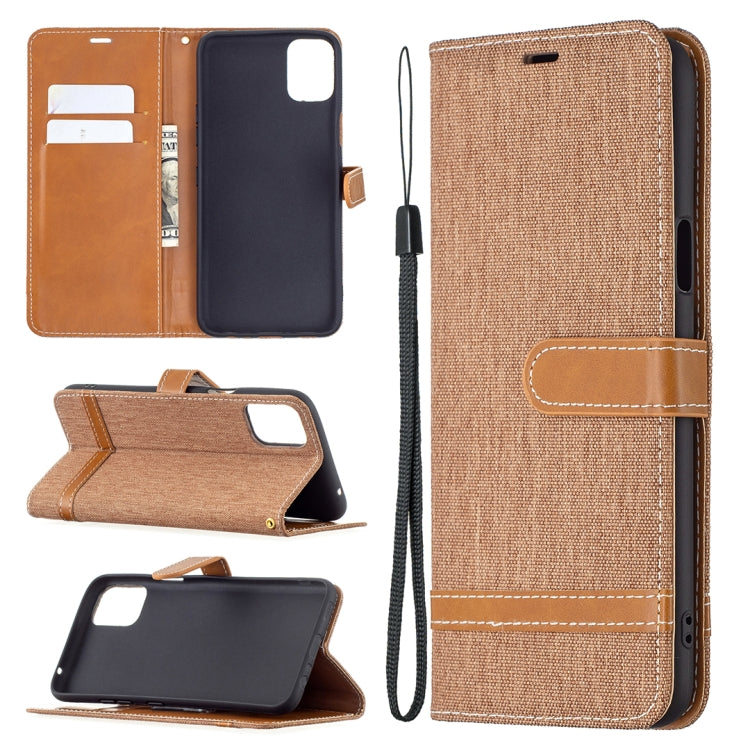 Funda de Cuero para LG K42 con Textura Denim, Soporte, Tragamonedas y Cordón (Marrón)