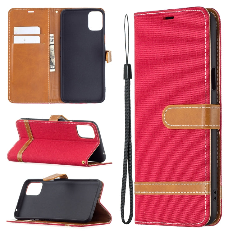 Funda de Cuero para LG K42 con Textura Denim, Soporte, Ranuras para Tarjetas y Cordón (Rojo)