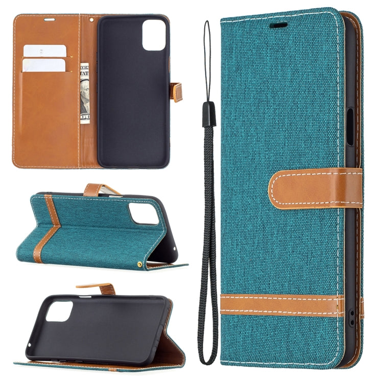 Funda de Cuero para LG K42 con Textura de Mezclilla, Soporte, Ranuras para Tarjetas y Cordón (Azul Oscuro)