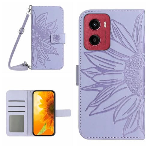 Funda de Cuero con Tapa y Cordón para Motorola Moto G05 Ht04 con Diseño de Girasol (Morado)