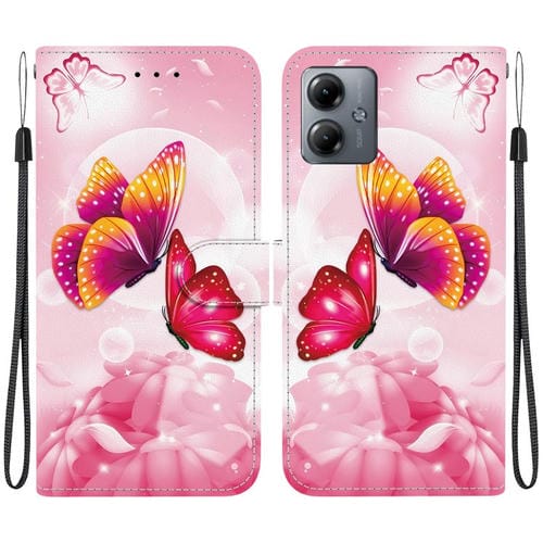 Funda de Cuero para Motorola Moto G14 con Dibujo de Colores y Textura de Cristal (Mariposas Rosas)