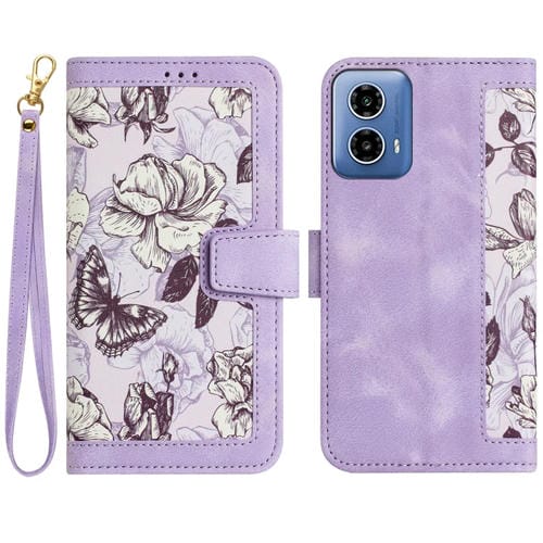 Funda de Cuero con Estampado Floral para Motorola Moto G84 con Cordón (Morado Claro)