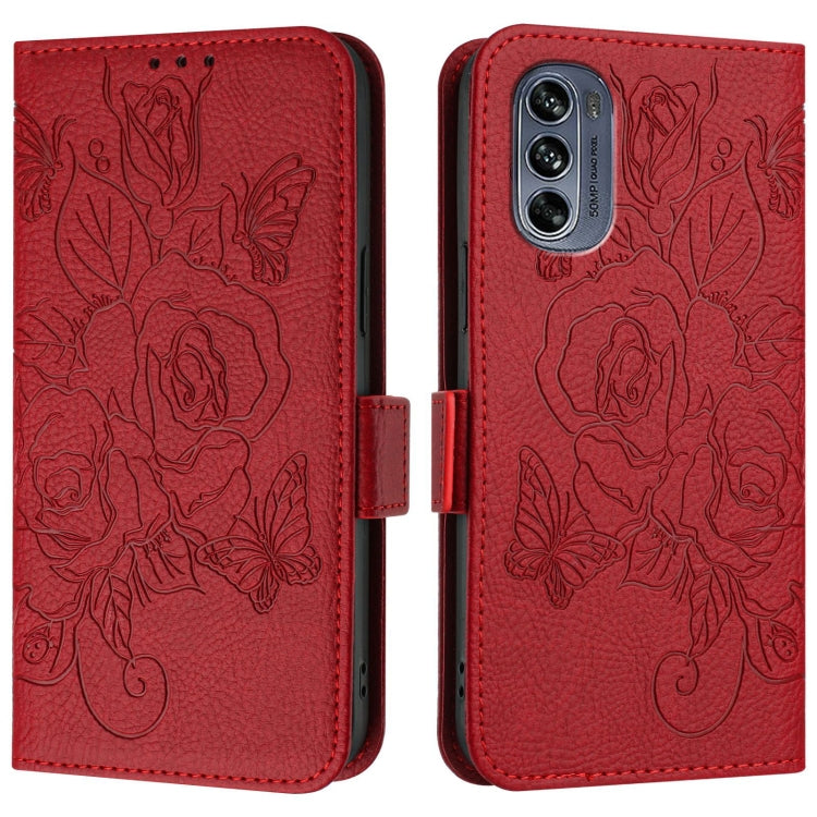 Funda de Cuero Antirrobo con RFID y Diseño en Relieve para Motorola Moto G62 5G (Rojo)
