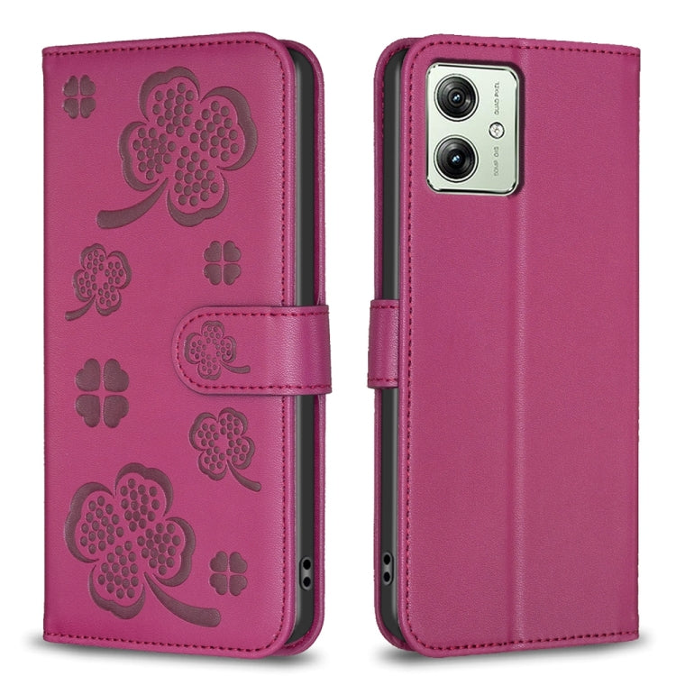 Funda de Cuero para Motorola Moto G14 4G con Relieve de Cuatro Hojas (Rojo Rosa)