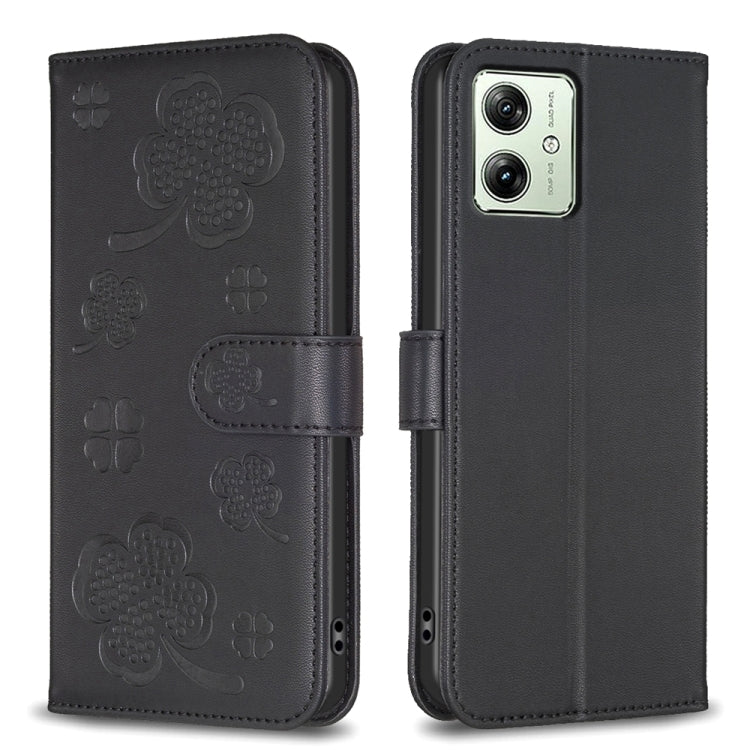 Funda de Cuero para Motorola Moto G54 5G Eu Edition con Relieve de Cuatro Hojas (Negro)