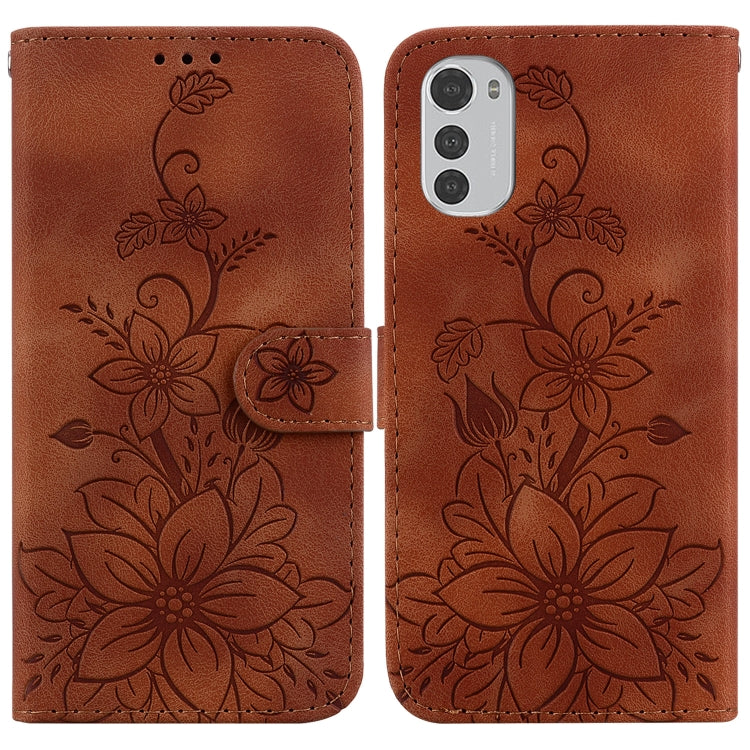 Funda de Cuero en Relieve para Motorola Moto G62 5G Lily (Marrón)