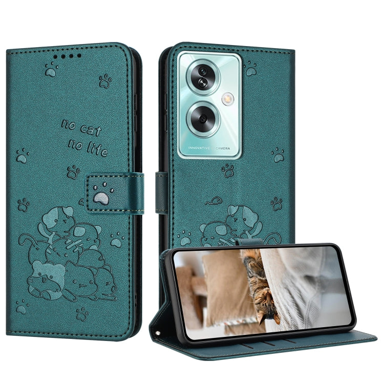 Funda de Cuero con Relieve de Gatito para OnePlus Nord N30 Se 5G con Cordón (Verde Oscuro)