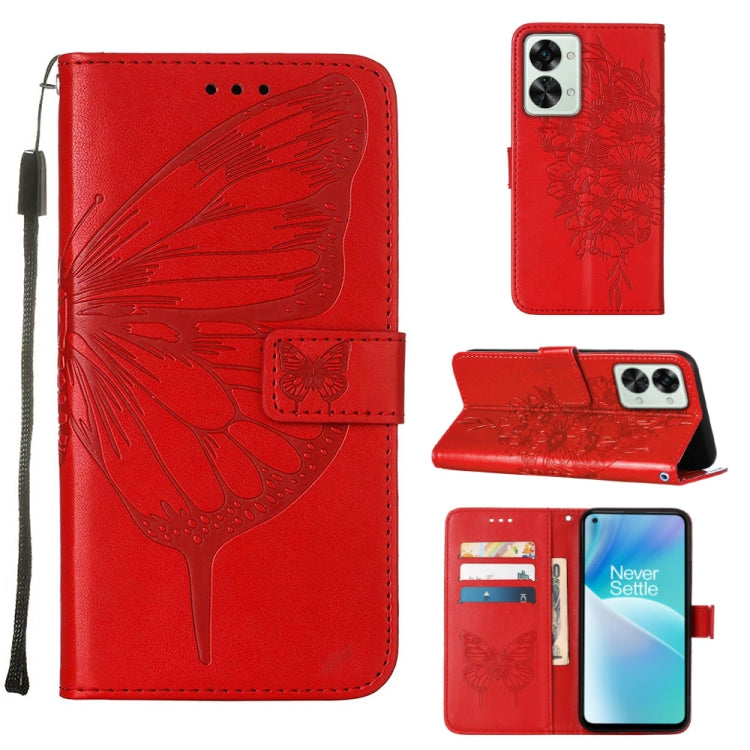 Funda de Cuero para OnePlus Nord Ce 2 Lite 5G con Mariposa en Relieve (Rojo)
