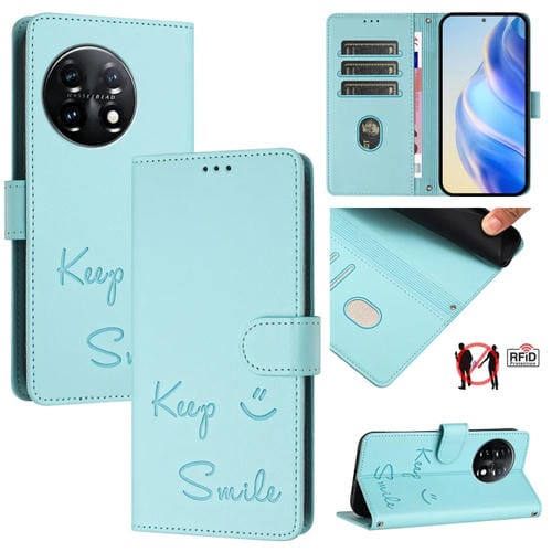 Funda de Cuero Rfid con Relieve Sonriente para OnePlus 11 (Verde Menta)
